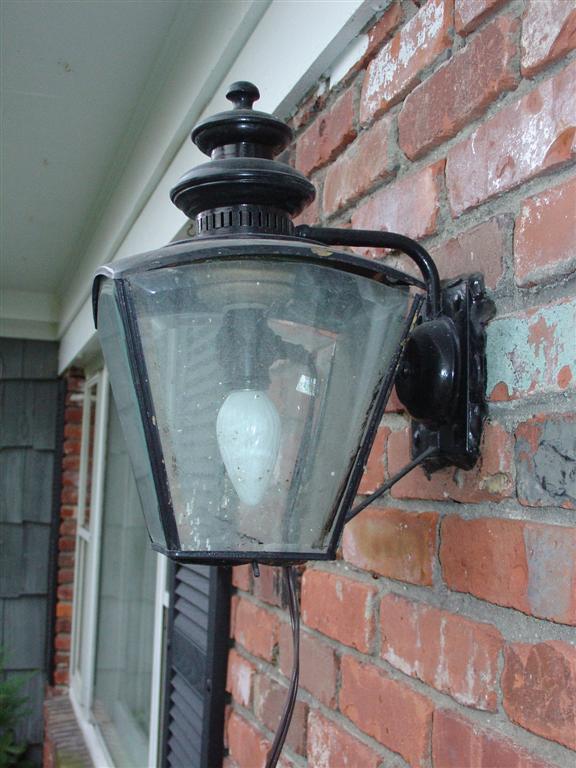 | Two windows are connected to one extension cord. | Each second floor window has one string of 200 lights wrapped around at least twice. | A closer view. This extension cord is attached to the outdoor light fixture next to the front door. |