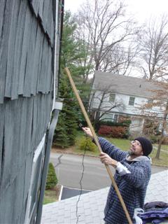 | It would be tough to get any ladder up on the garage roof, and I'd rather not hang over the top roof. This is another place where my reach stick comes in handy. | My big helper. He likes climbing the ladder and going on the roof. I am more nervous about him being on the roof than he is. |