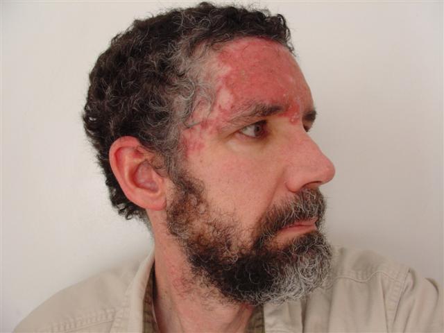 March 7, 2007. Healing Phase Day 12. It is incredible how fast my skin is regenerating. Everyone tells me how good I look (well my forehead anyway!). Today is the first day in over a month that I felt like I was back to normal. See left, right, forehead. My skin is still pink and there are still some red marks, but every day there are less and less. It is still itchy, but actually feels good to gently massage it with soap and water. If you met me now for the first time you might just think I had scraped my head. Even my eyes seem less swollen. |
