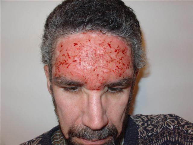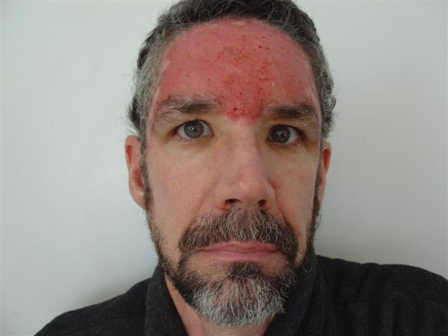 February 27, 2007. Healing Phase Day 4. My forehead is really bloody and surprisingly I look even worse now than I did when I was applying the Efudex. It is quite painful. My skin feels very dry and tight. The creams are soothing for an hour or two but then the pain returns. It is too itchy and messy to wear a hat. I'm glad its not too cold out. I've been using Tylenol occasionally to help with the pain. |