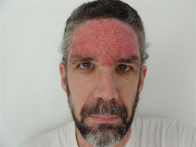 February 11, 2007. Day 18. The red spots on my forehead are coming together and my forehead is turning a solid ugly red. I get a lot of stares now from people who haven't seen me recently. There are still a few scattered white spots amid the redness on my forehead, especially near my scalp on the left and right side. I wonder if they will eventually turn red also? It is very itchy and standing in the shower is about the only relief I can get. |