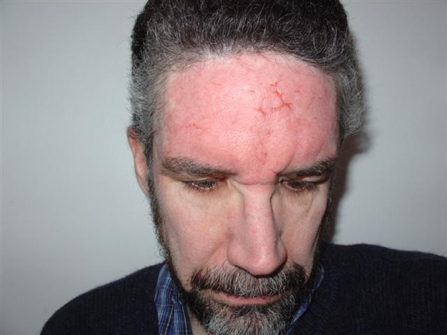 February 24, 2007. Good news! Yesterday Dr. Grossman told me I'm done with the Efudex and now it is time for my skin to heal. He also told me that my reaction was one of the worst he had ever seen in his thirty years of practicing dermatology, so most likely your reaction will not be as bad as this. However, my reaction did validate his original diagnosis that my entire forehead was one big AK, and that spot-treating with liquid nitrogen would have been a waste of time. The doctor gave me prescriptions for two topical creams, Mupirocin 2%, an antibiotic, and Fluticasone Propionate 0.05%, a corticosteroid. The latter is better known as the active ingredient in Flonase, an anti-inflammatory nasal spray used to treat allergies! Three times per day for the next two weeks I will mix and apply these creams to my forehead. As I later learned, I am going to look a lot worse before I get better, but then I will improve rapidly. Keep reading and don't get discouraged. The end results are worth it. |